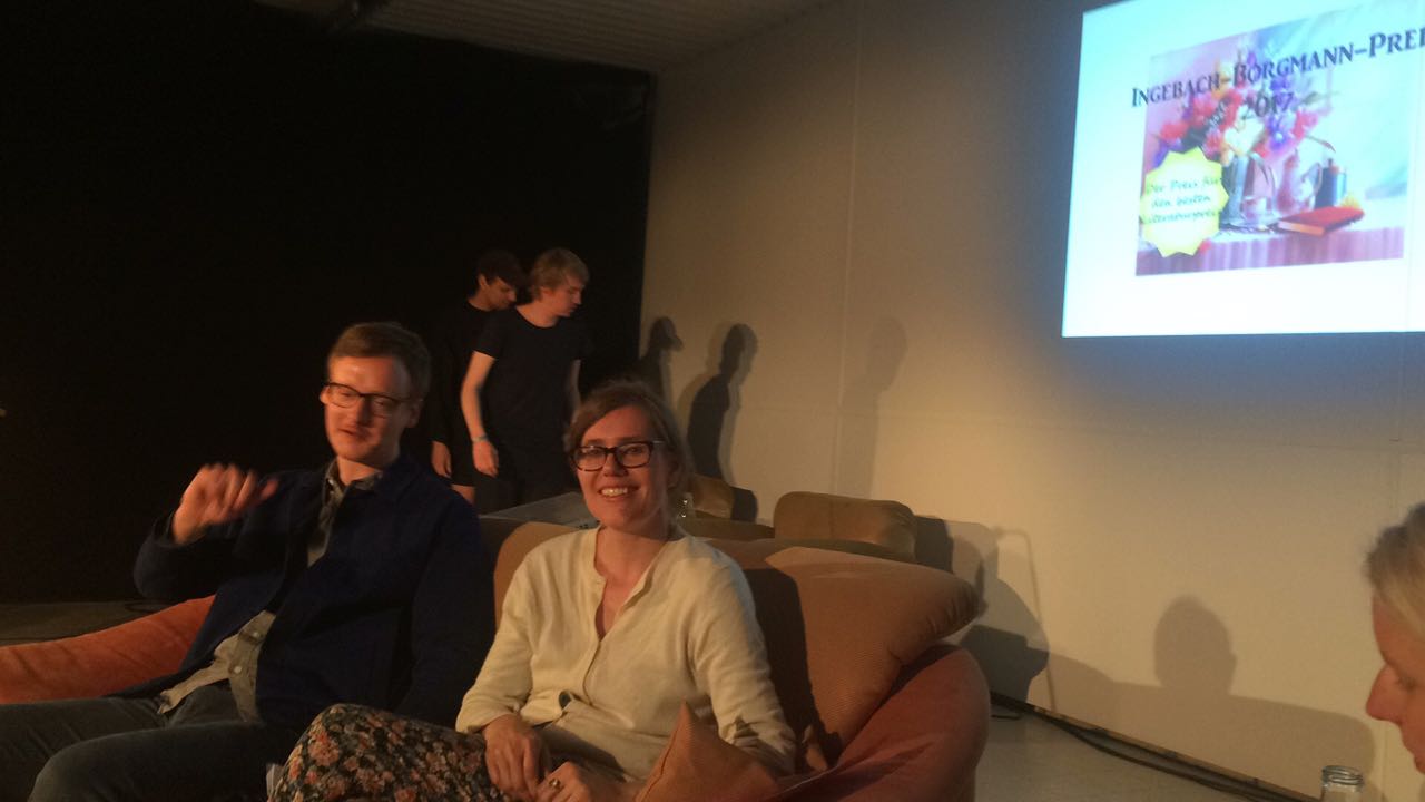 in der aldi-halle, wohin wir vor dem regen geflüchtet sind, ist der raum beengter und die akustik eine andere als draußen auf dem parkplatz. die stimmen der lesenden vermischen sich, schweizerisch, österreichisch, norddeutsch, plattdeutsch, wortfetzen, satzfetzen aus sechs verschiedenen texten. stört aber nicht. im gegenteil. und die deko ist super.